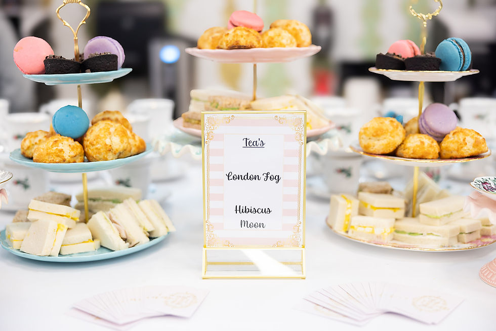 No Regency soirée would be complete without a proper spread, and Michelle’s Patisserie delivered beautifully—think vintage china, a powder-blue gilded teapot, scones with jam and clotted cream, macarons, mini chocolate caramel tarts, and three varieties of finger sandwiches. Every detail was captured by Lauren Maria Photo, whose eye for atmosphere and storytelling brought the full magic of the day to life in every frame.